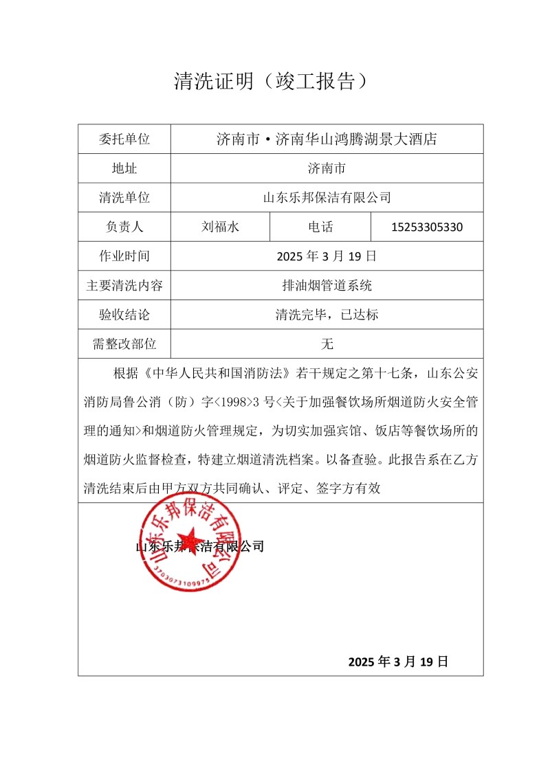 濟(jì)南市·濟(jì)南華山鴻騰湖景大酒店清洗報(bào)告25.3.19