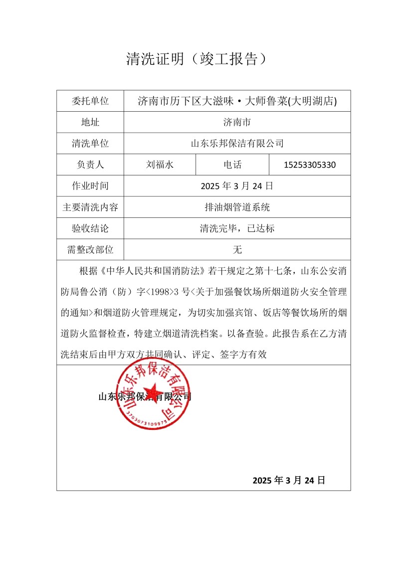 濟南市歷下區(qū)大滋味·大師魯菜(大明湖店)清洗報告25.3.24