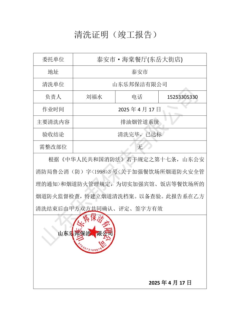 泰安市·海棠餐廳(東岳大街店)清洗報告25.4.17