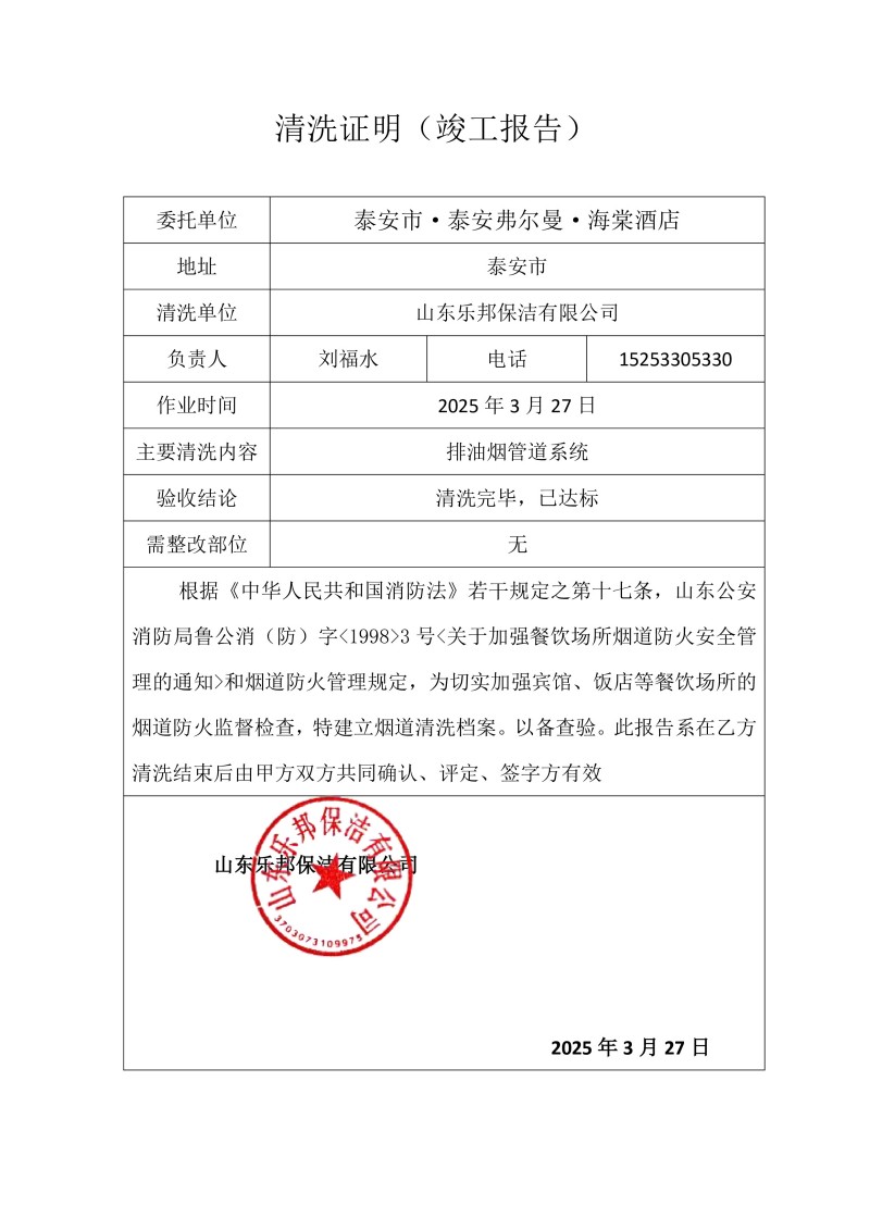 泰安市·泰安弗爾曼·海棠酒店清洗報(bào)告25.3.27