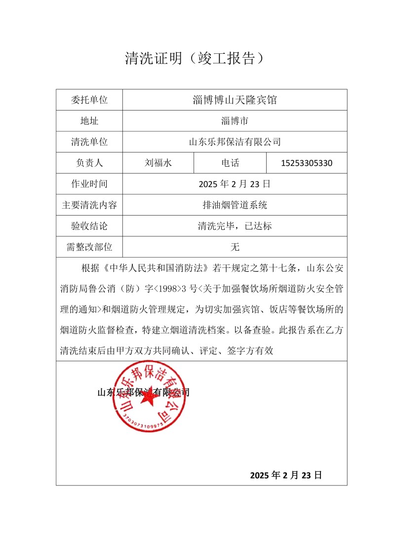 淄博博山天隆賓館清洗報(bào)告25.2.23