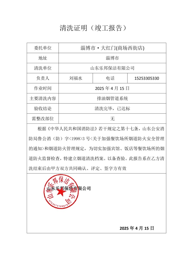 淄博市·大紅門(商場西街店)清洗報(bào)告25.4.14