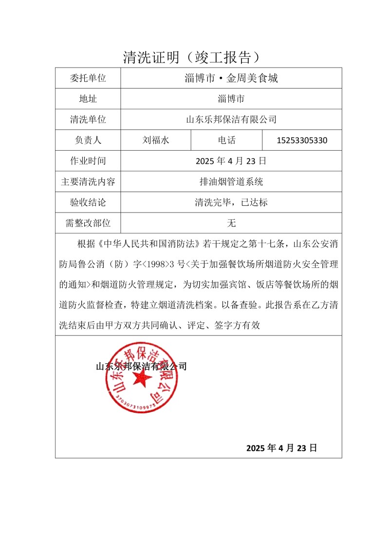 淄博市·金周美食城清洗報(bào)告25.4.23