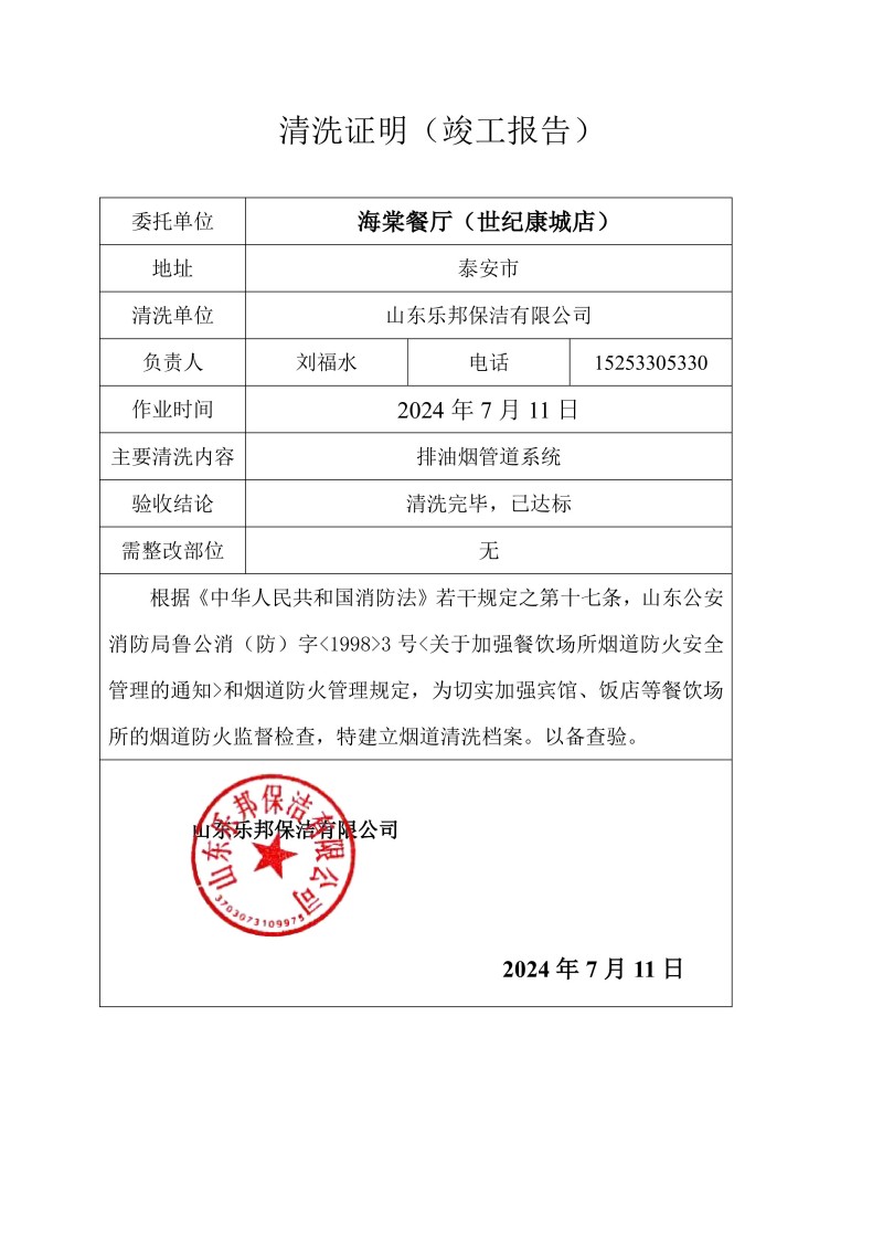 海棠餐廳(開發(fā)區(qū)店)清洗報告24.7.7