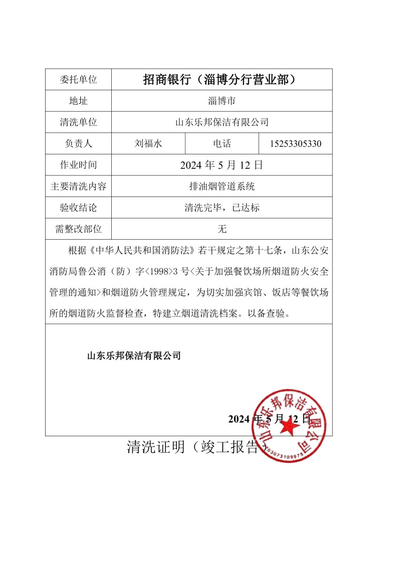 招商銀行(淄博分行營業(yè)部)清洗報(bào)告24.5.12
