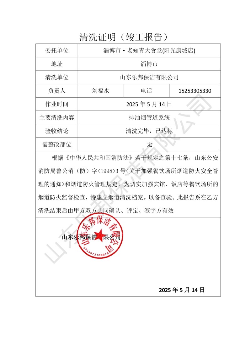淄博市·老知青大食堂(陽光康城店)清洗報(bào)告25.5.14