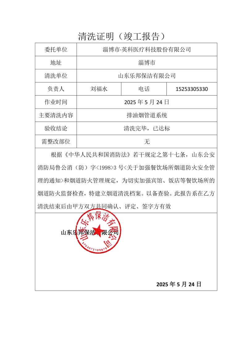 淄博市·英科醫(yī)療科技股份有限公司清洗報告25.5.24