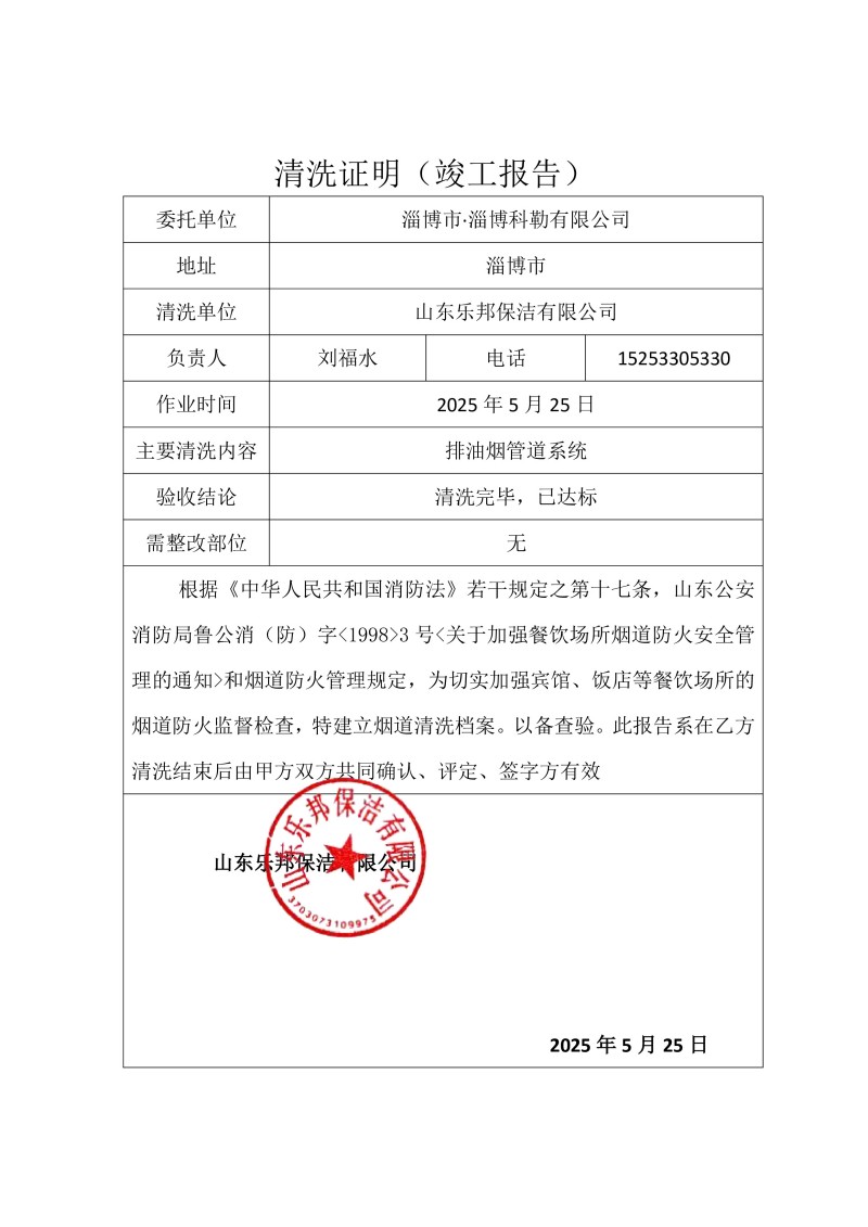 淄博市·淄博科勒有限公司清洗報告25.5.25